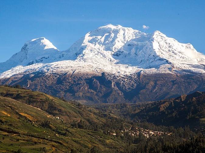El Nevado Huascarán es la montaña más alta del Perú y la más alta de los trópicos, con una altitud de 6,768 metros sobre el nivel del mar en su punto más elevado. Ubicado en la Cordillera Blanca, dentro del Parque Nacional Huascarán, este majestuoso nevado es un emblema nacional y un destino de renombre para el montañismo. Es uno de los destinos más codiciados para montañistas expertos debido a su altitud y desafíos técnicos. También atrae a turistas por sus espectaculares vistas y su proximidad a las Lagunas Llanganuco